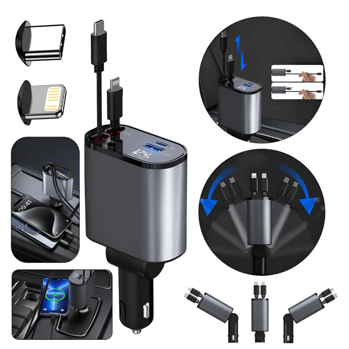 Carregador De Carro Turbo 120W Cabo Retrátil Com Projetor
