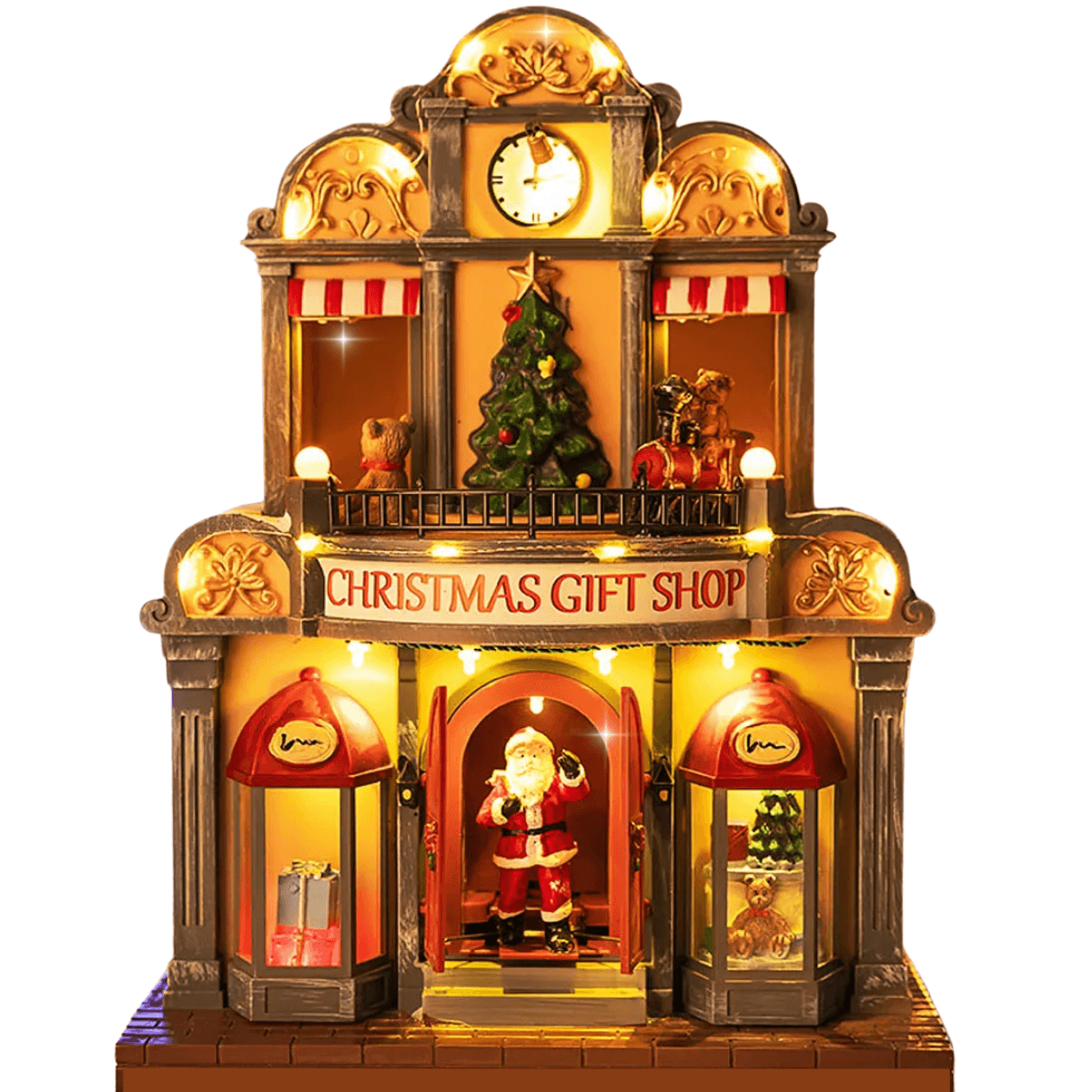Ao ligar este encantador cenário, as luzes brilham suavemente, uma melodia natalina harmoniosa começa a tocar, e a porta da loja se abre revelando Papai Noel sorridente, pronto para espalhar alegria e emoção!