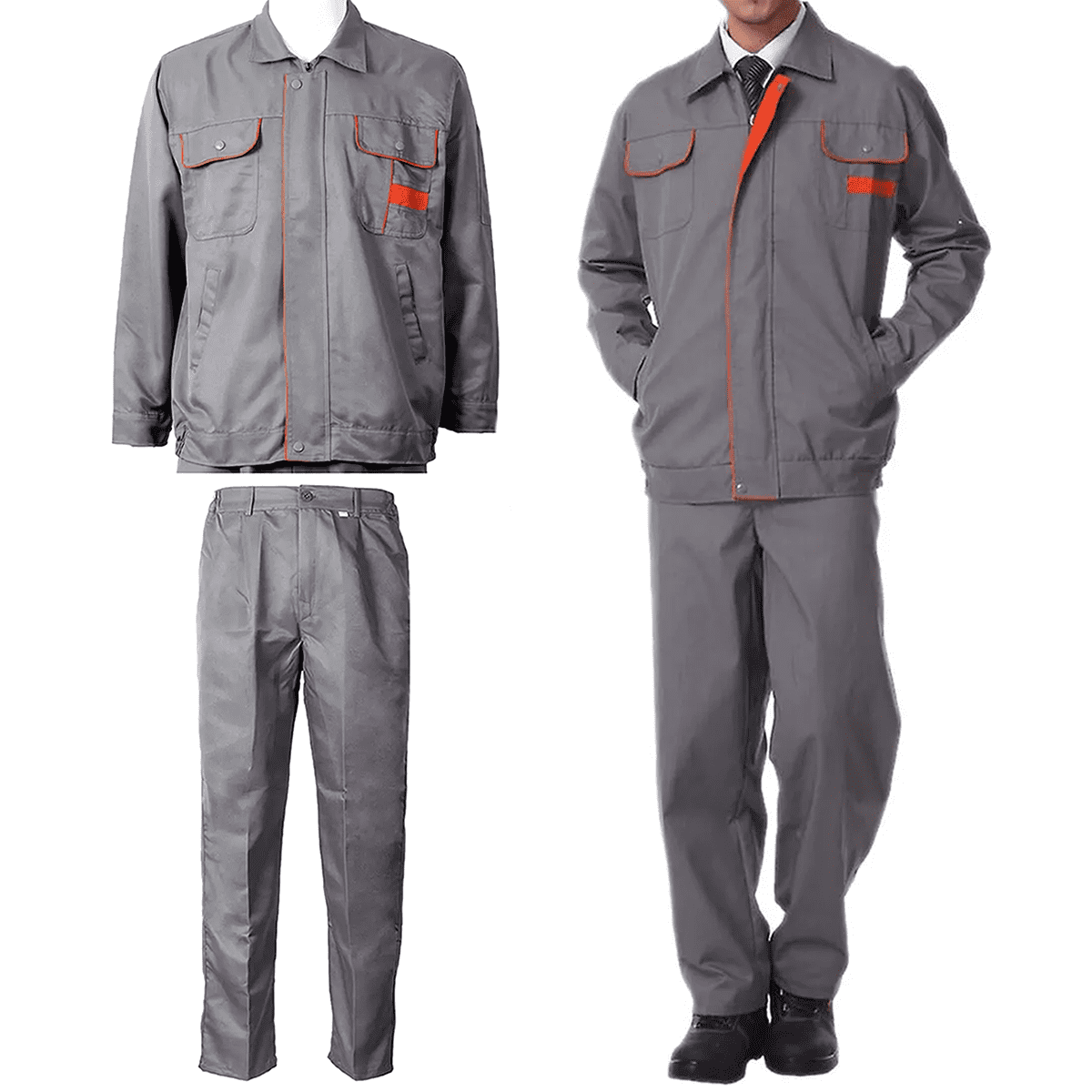 Jaqueta de trabalho de manga comprida, gola, fecho com zíper e botão de pressão, fácil de colocar e tirar.